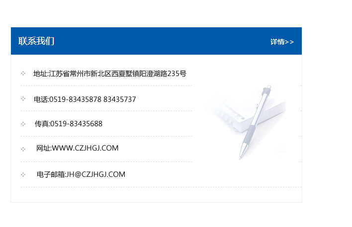地址:常州市新北區友邦商務大廈1幢16、17層  電話:0519-85101652  傳真:0519-85112595  郵編:213022  網址:www.cz-jiayue_cn.kantu001.com  郵箱:xiajifengaa@163.com